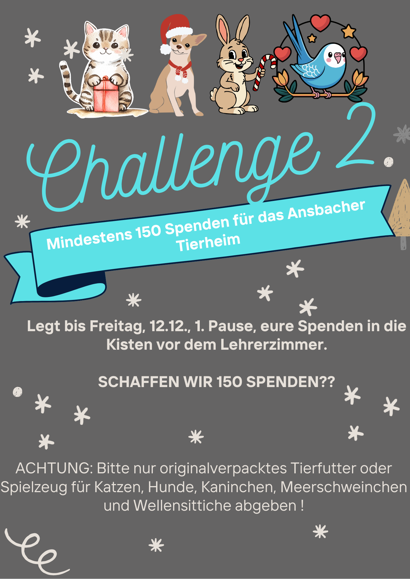 Auf Initiative der Schülerschaft und der Verbindungslehrkraft Ute Häßlein war die gesamte Schulfamilie in den drei Schulwochen vor Weihnachten eingeladen, sich drei Herausforderungen zu stellen – mit dem Ziel, anderen zu helfen und Freude zu schenken.