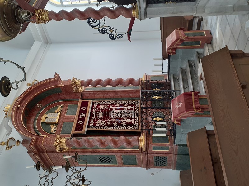 Herr Biernoth informierte uns auch über die Geschichte der Synagoge: 1744-46 erbaut, war sie lange Zeit das Zentrum jüdischen Lebens in Ansbach. Dass die Synagoge die Nazi-Jahre überstanden hat, verdankt sie ihrer eingebauten Lage in der Altstadt. Seit 1964 ist sie kein Raum für Gottesdienste mehr, sondern ein musealer Raum. Sie ist eine der wenigen barocken Synagogen in Süddeutschland, die nach der NS-Zeit noch zu bewundern sind.