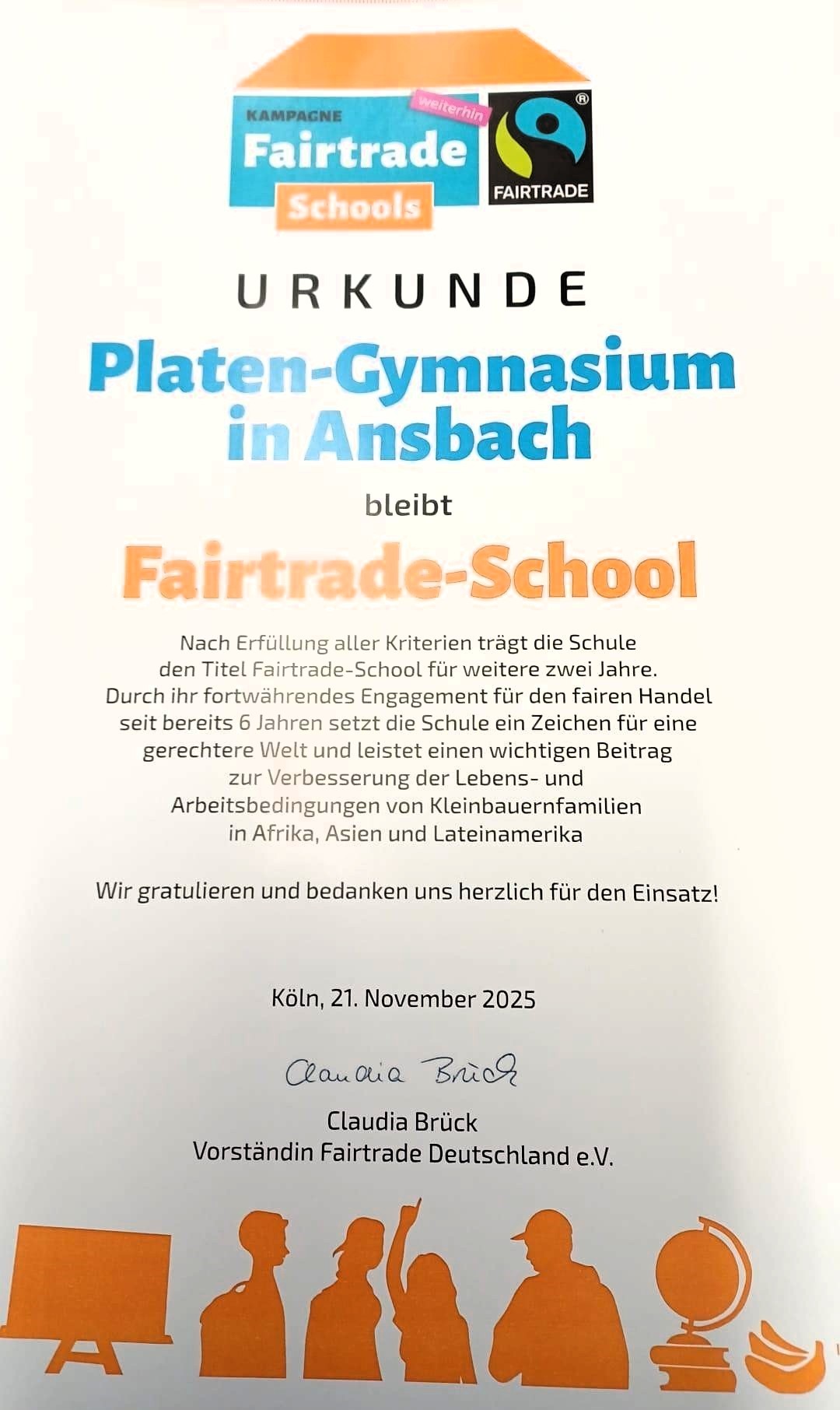 Seit mehr als zehn Jahren setzen sich Lehrkräfte, Schülerinnen und Schüler des Platen-Gymnasiums für fairen Handel ein. Im November 2019 wurde dieses Engagement mit der Auszeichnung zur Fairtrade School gewürdigt. Im Rahmen einer großen Feier in der Pausenhalle wurde die Urkunde an das Platen-Gymnasium übergeben.