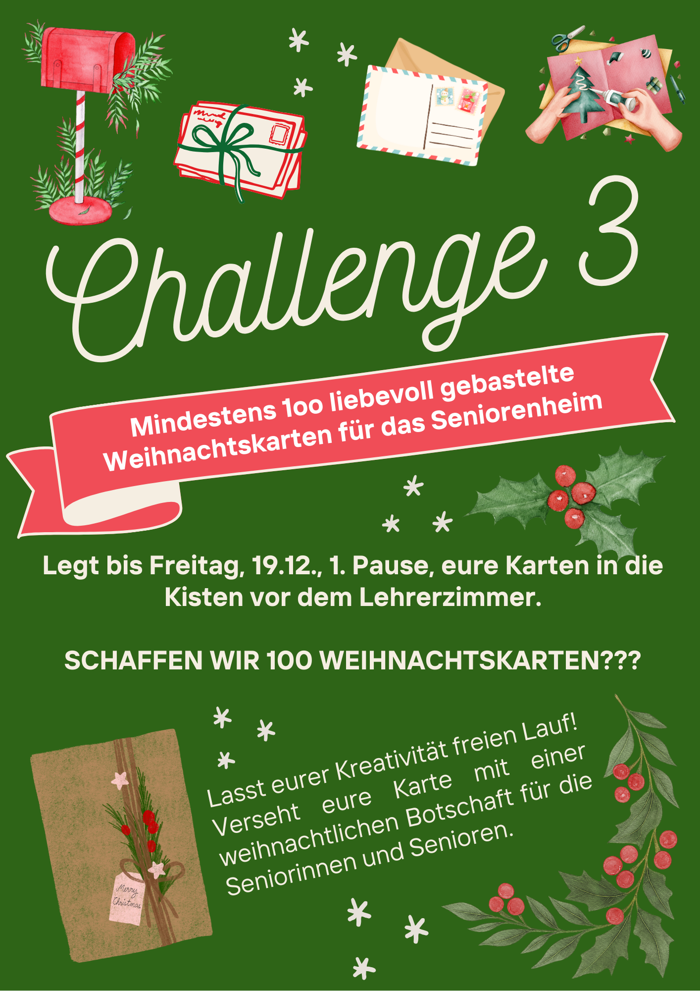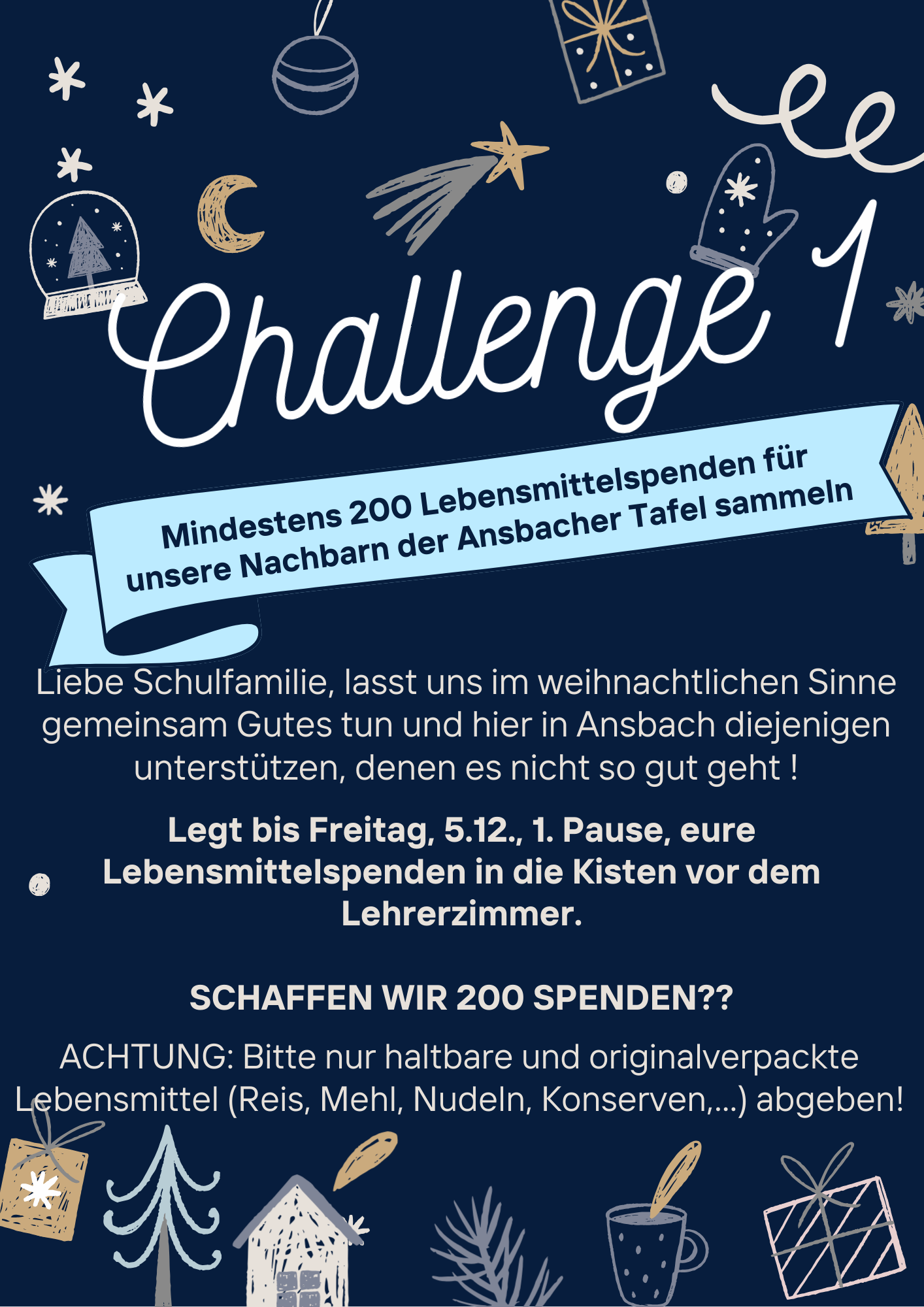 Auf Initiative der Schülerschaft und der Verbindungslehrkraft Ute Häßlein war die gesamte Schulfamilie in den drei Schulwochen vor Weihnachten eingeladen, sich drei Herausforderungen zu stellen – mit dem Ziel, anderen zu helfen und Freude zu schenken.