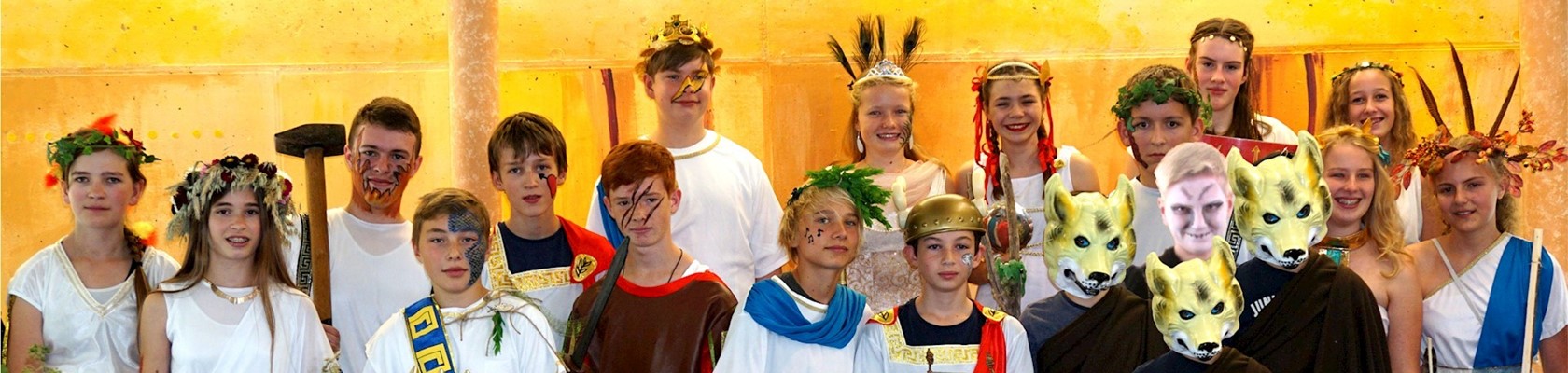 Beim Römertag am 30.9.2018 (Orga: Martin Escher und das P-Seminar Latein) war die Götterwahl ein Highlight der Veranstaltung. Was es damit auf sich hat? Auf einem Laufsteg präsentierten sich die Olympischen Götter und die Zuschauer konnten anschließend ihren Lieblingsgott wählen. Um die kleine Olympbewohner in Szene zu setzen, kümmerte sich die AG Schulspiel um die Maske, einen Teil der Requisiten und Kostüme.